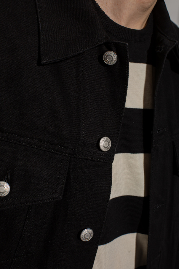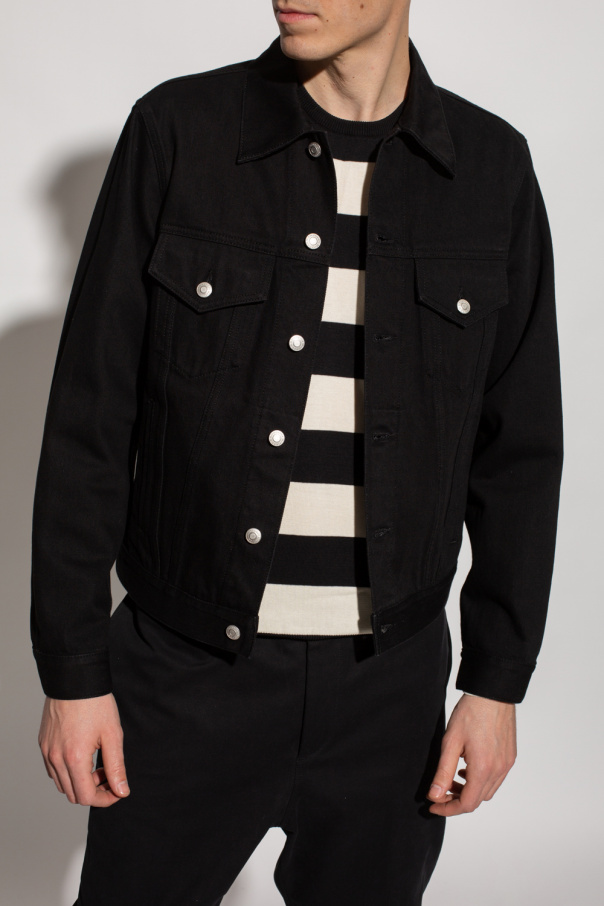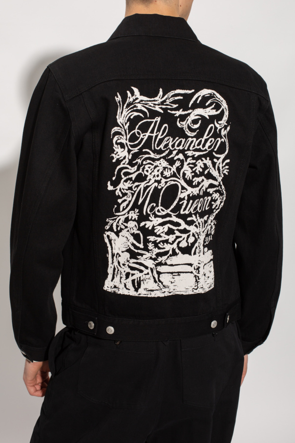 Black denim jacket from Alexander McQueen. Embellished at back with a white graphic logo print inspired by William Blake's work, this style features button fastenings, two welt pockets, two flapped button pockets and long sleeves with button cuffs.