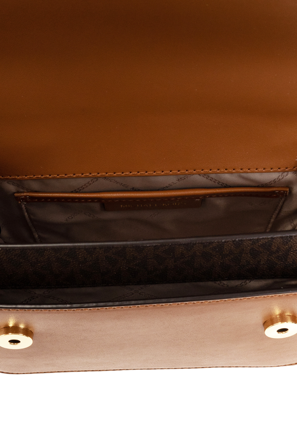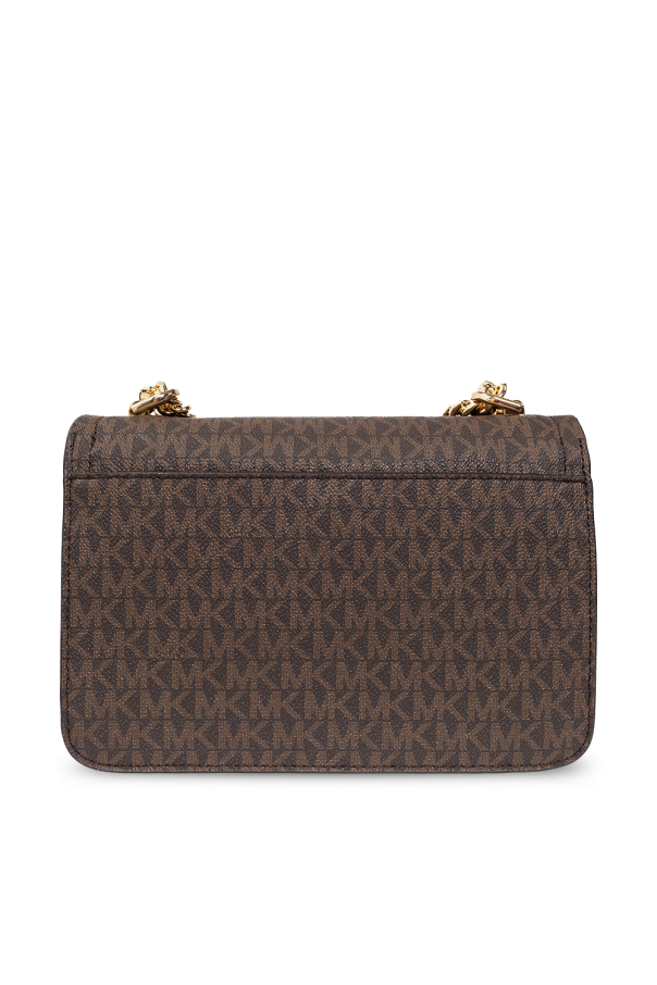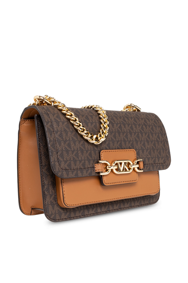 Brown ‘Heather Large’ shoulder bag from Michael Michael Kors. Crafted from faux leather with an ‘MK’ monogram, this item features a snap-fastened flap, metal logo appliqué, snap-fastened back pocket, double shoulder chain, gold-tone metal hardware and one internal compartment with one slip pocket and a compartment with six card slots and one pocket.