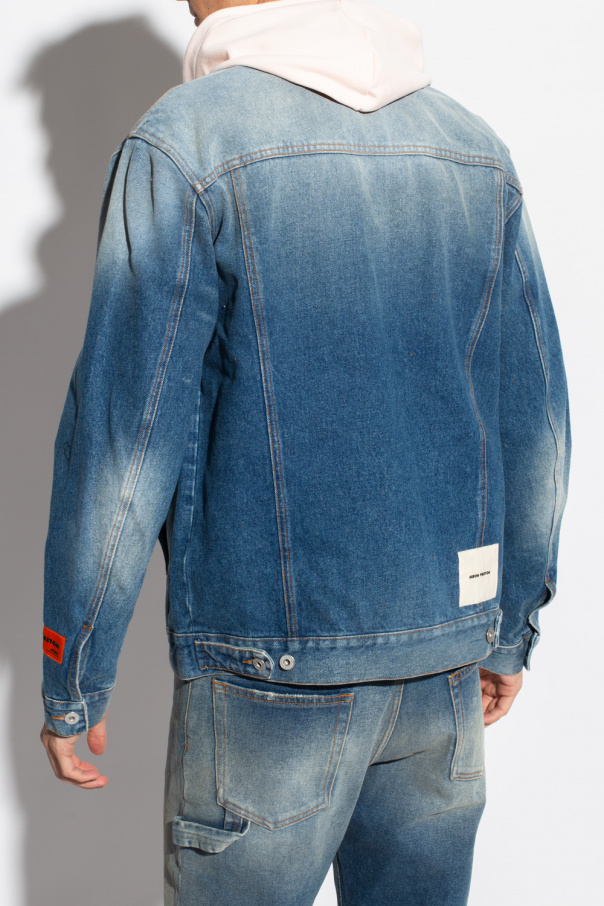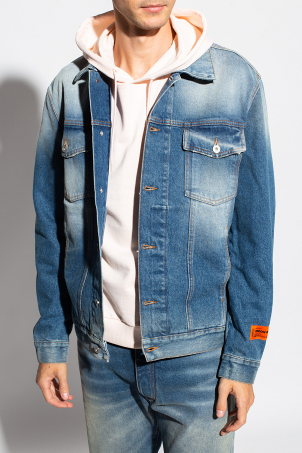 Blue denim jacket from Heron Preston. Emblazoned with logo patches, this style fastens via buttons and features two flapped chest pockets with buttons and long sleeves with button cuffs.