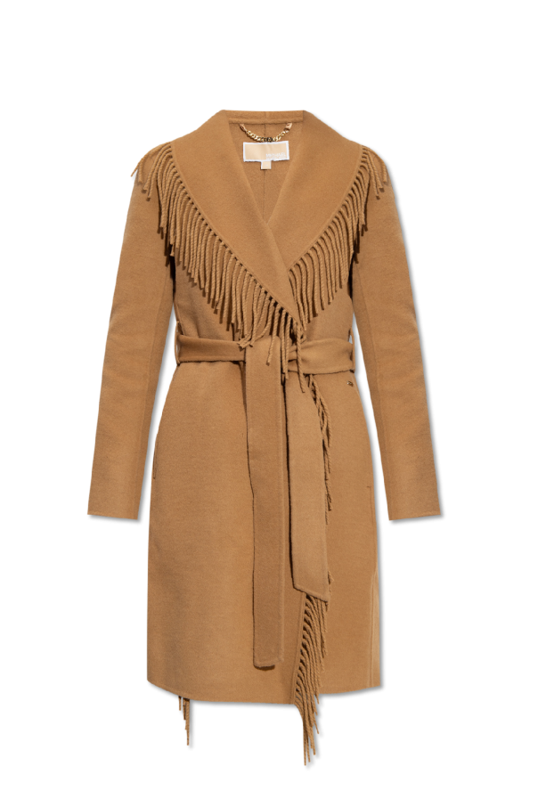 Brown coat from Michael Michael Kors. Cinched with a belt at the waist, this style features a button closure, fringe detailing, two slip pockets and long sleeves.