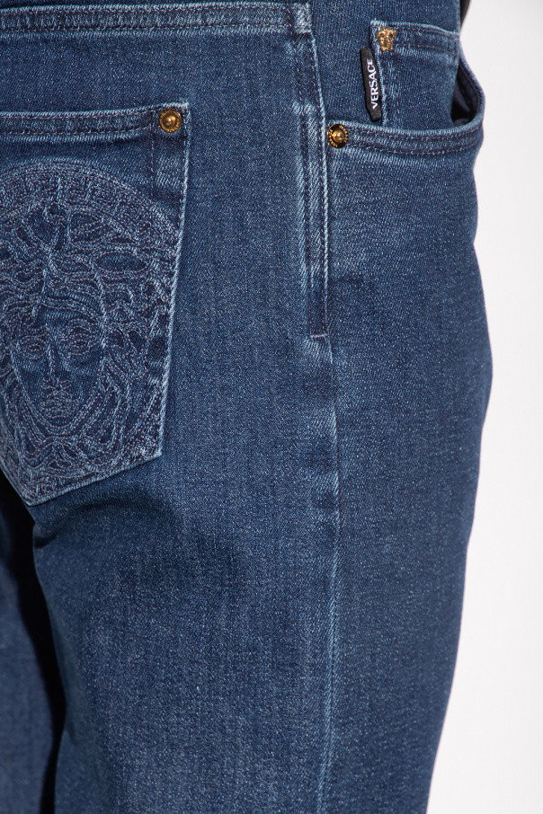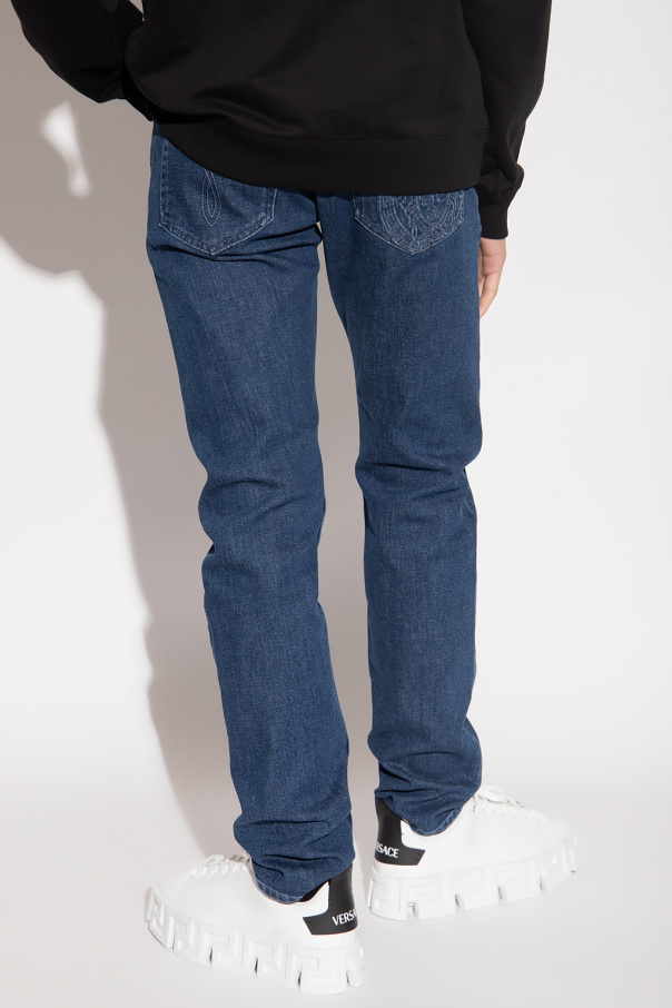 Navy slim fit jeans from Versace. Fastened with a zip and decorative buttons in black and gold-tone, this pair features a patch, appliqué, black leather patch with the iconic Medusa head appliqué, Greca motif, logo detail, five slip pockets with a Medusa embroidery and tapered legs.