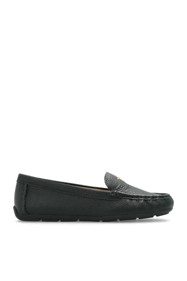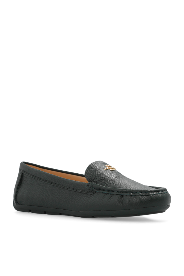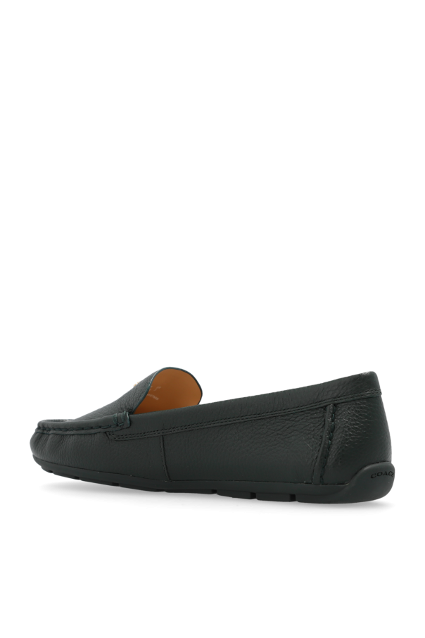 Dark green ‘Marley’ moccasins from Coach. Crafted from leather, this pair features a metal logo detail in gold-tone and a green rubber sole.