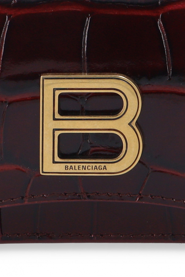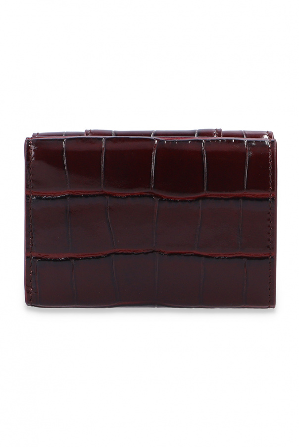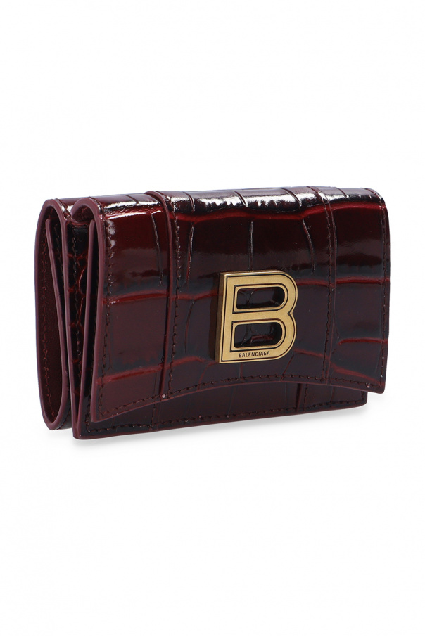 Maroon bifold wallet from Balenciaga. Crafted from textured leather, this design features a snap fastening, gold-tone metal logo as well as an internal coin pocket, three card slots and a bill compartment inside.