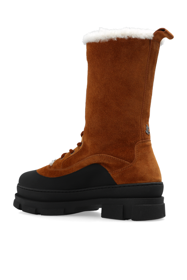 Brown and black ‘Aldea’ snow boots from Jimmy Choo. Crafted from suede and leather with cream faux fur trims, this lace-up pair features a silver-tone metal logo detail and black rubber sole.