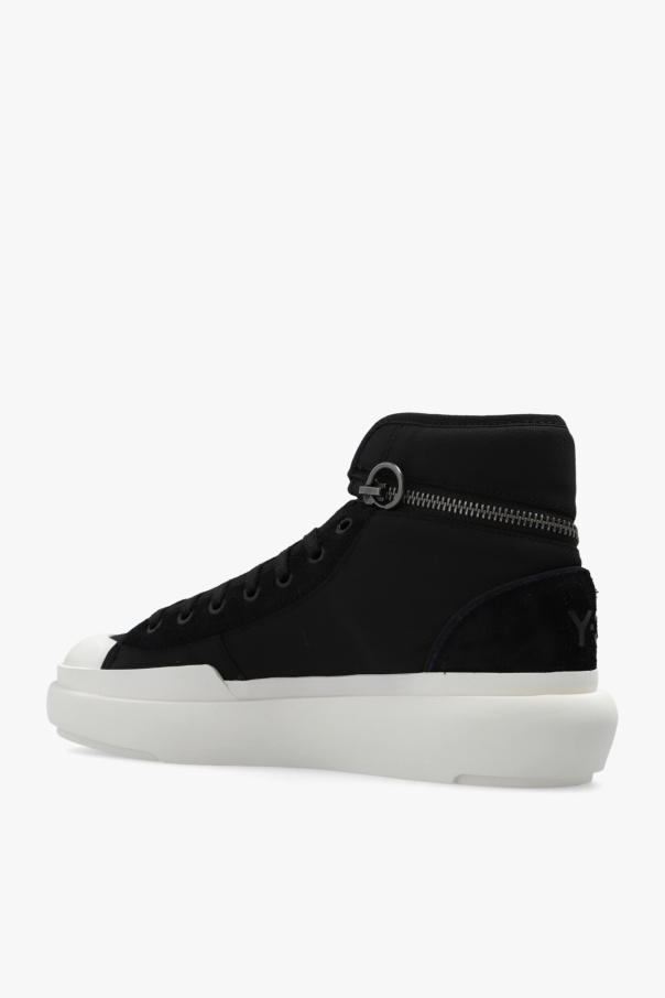 Black ‘Ajatu Court High’ sneakers from Y-3 Yohji Yamamoto. Crafted from leather and fabric with a high-top silhouette, this lace-up model sits on a white rubber sole and features a branded tongue and a back zipper.