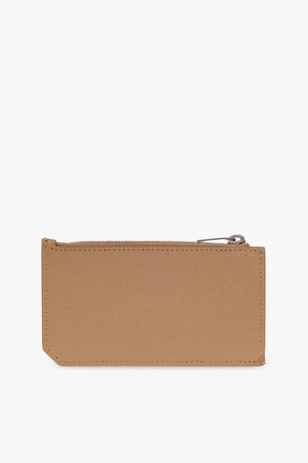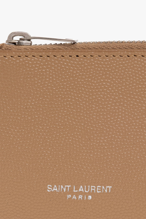 Beige card case from Saint Laurent. Made of leather, this item features an embossed silver-tone logo, one zip pocket and five card slots.