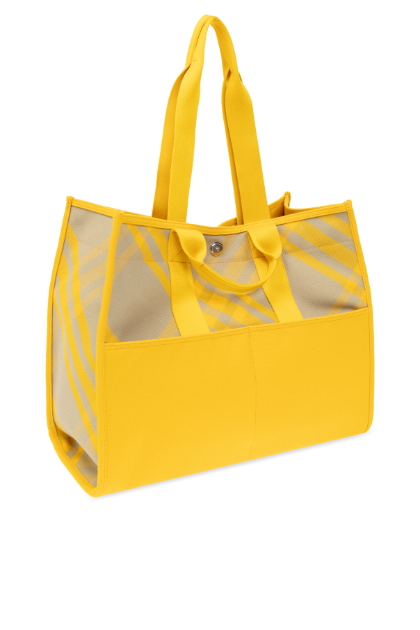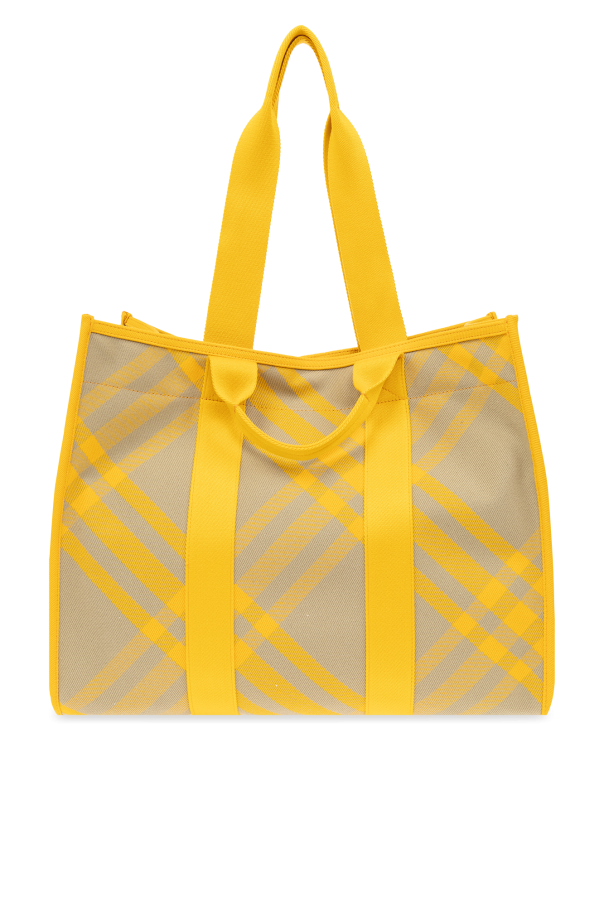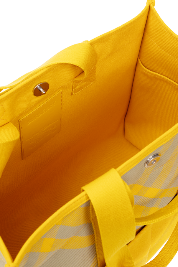 Yellow and green shopper bag from Burberry. Crafted from cotton, this design features a snap closure, check pattern, two front pockets, four half-round handles, one internal compartment and black metal hardware.