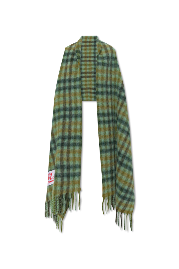 Green vest with a shawl from Marni. Made from a wool and mohair blend, this design features a check pattern, fringe edges and cream patch with a red logo embroidery.