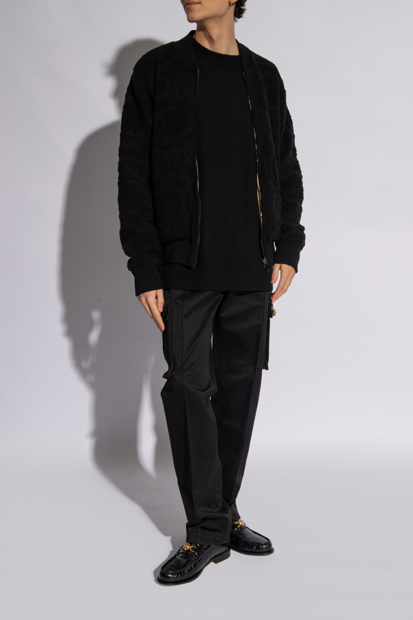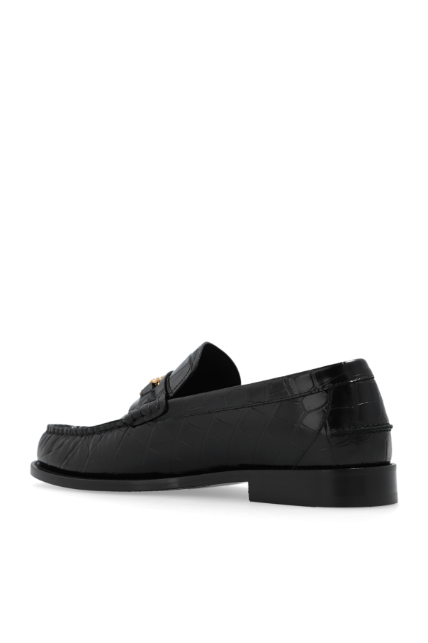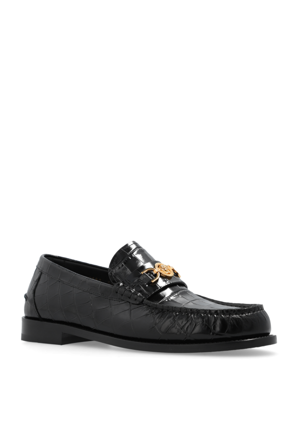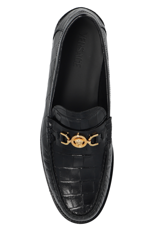 Black loafers from Versace. Made from leather with a crocodile skin effect, this model sits on a black leather sole and showcases gold-tone hardware with the brand's signature Greca and Medusa face motifs.