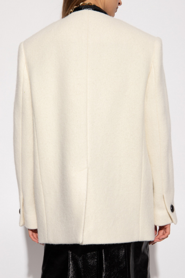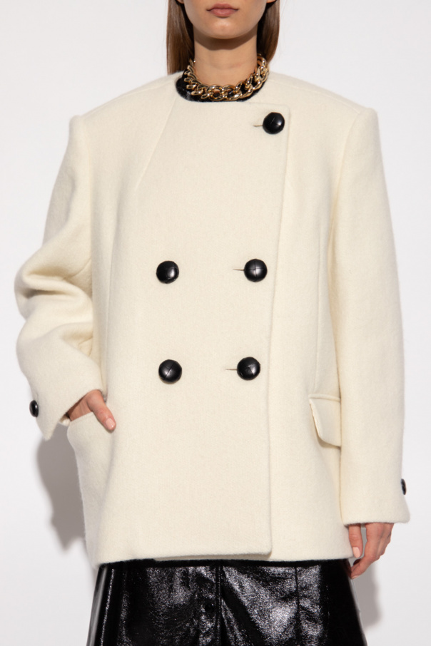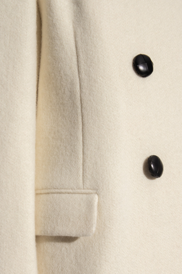 Cream coat from Isabel Marant. Crafted from wool with a double-breasted silhouette, this style features distinctive black buttons, two flapped pockets on the front, padded shoulders, long sleeves and a single back vent.