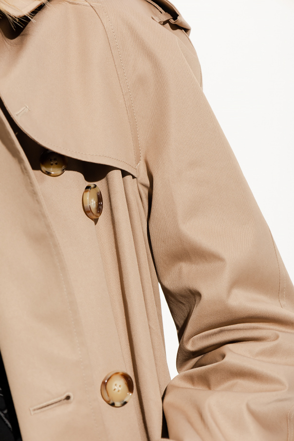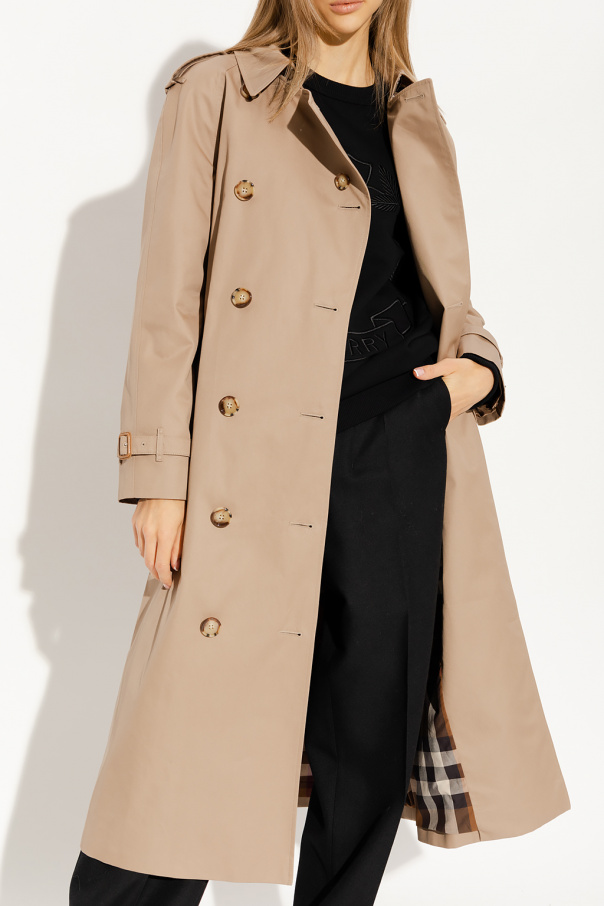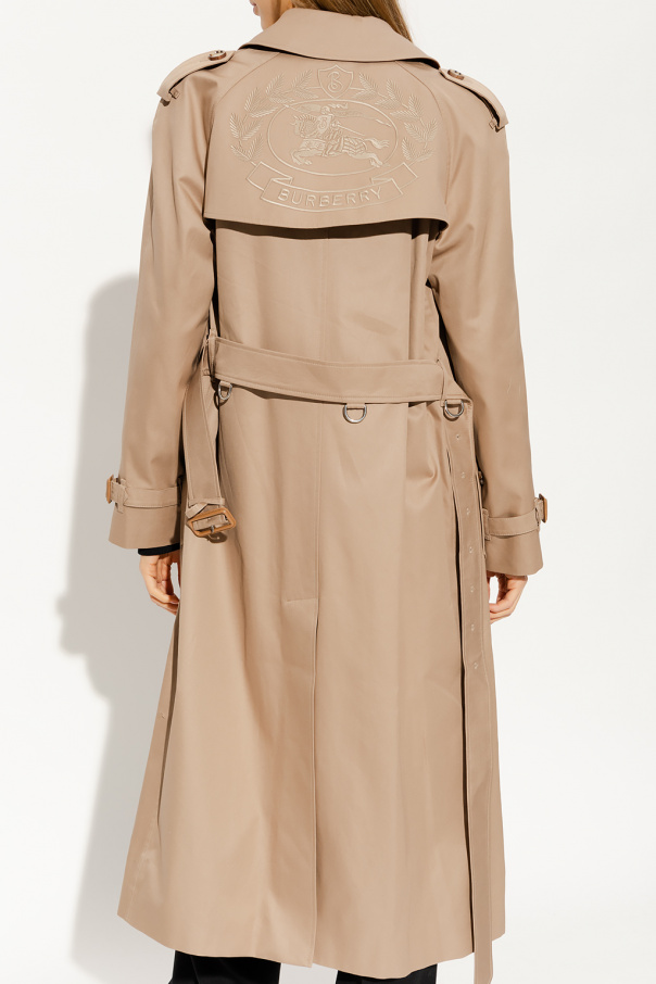 Brown ‘Waterloo’ long trench coat from Burberry. Crafted from cotton gabardine developed for its crease-resistant structure and woven at the Burberry Mill in Yorkshire, this style features a double-breasted silhouette, button fastenings, a waist-cinching buckle belt, a collar with a hook & eye closure, shoulder epaulettes, a storm flap and two pockets with button closures, an embroidered ‘Equestrian Knight Design’ at the back, a single back vent and long sleeves with button cuffs.