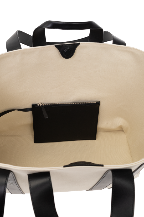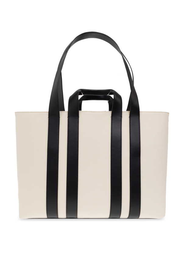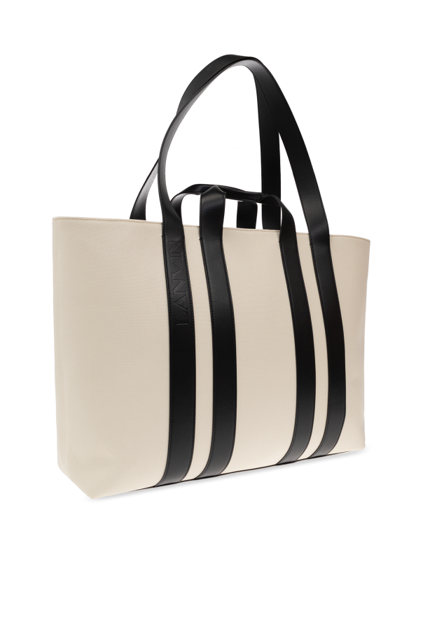Cream ‘Ballade East West’ shopper bag from Lanvin. Crafted from cotton, this design secures with a magnetic snap and showcases an embossed logo on the front. It is complete with four handles, silver-tone metal hardware and one internal compartment with a removable zip pouch.