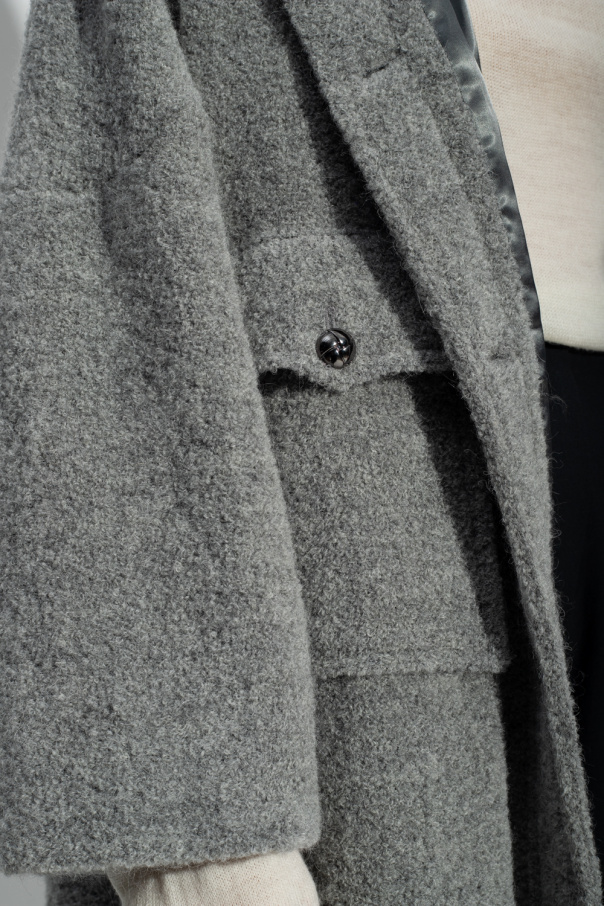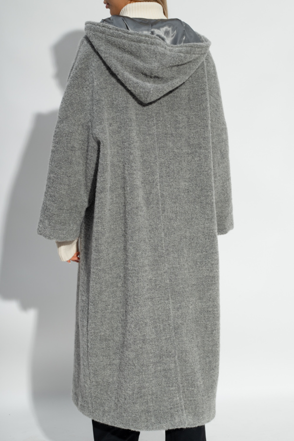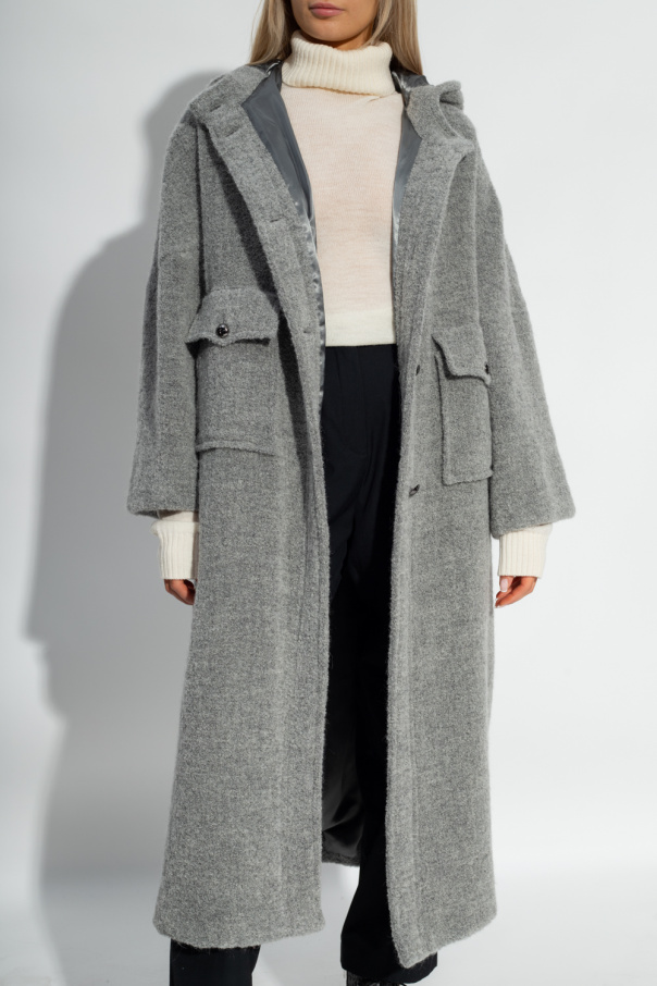 Grey coat with a hood from Emporio Armani. Crafted from a wool blend, this style features button fastenings, long sleeves and four pockets on the front, including two flapped ones with buttons.
