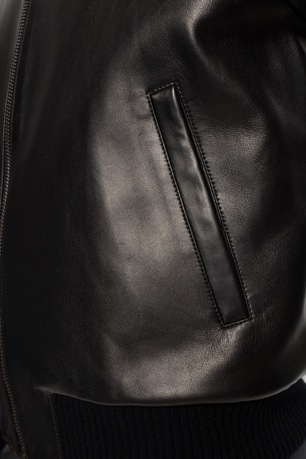 Black bomber jacket from Gucci. Made of leather. Zip fastening. Two pockets on the front. Beige print at the back. Long sleeves. Ribbed hem, collar and cuffs.