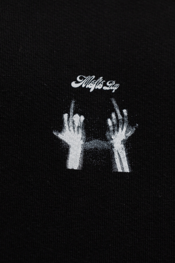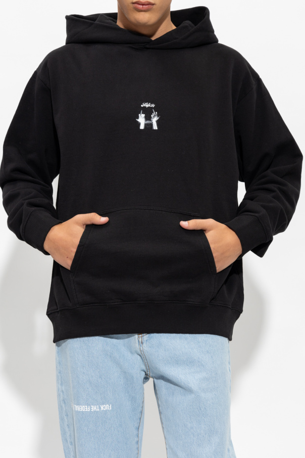 Black hoodie from MSFTSrep. Made of cotton, this long sleeve design features a grey and white logo print, front pocket and ribbed edges.