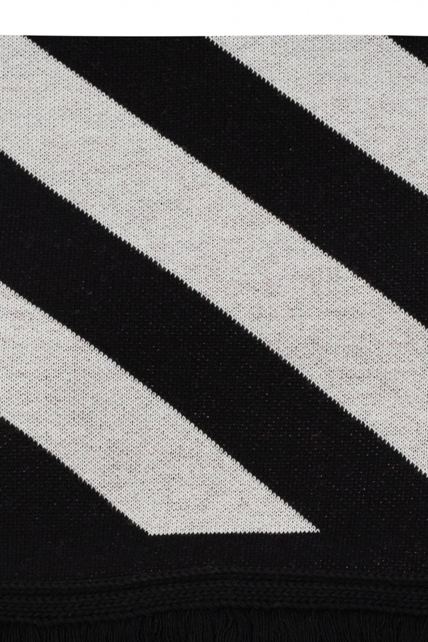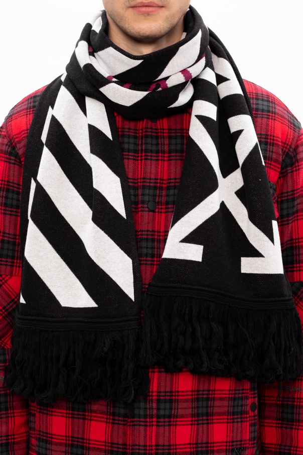 Black scarf from Off-White. This item is enriched with an embroidered logo pattern in white and fringe edges.