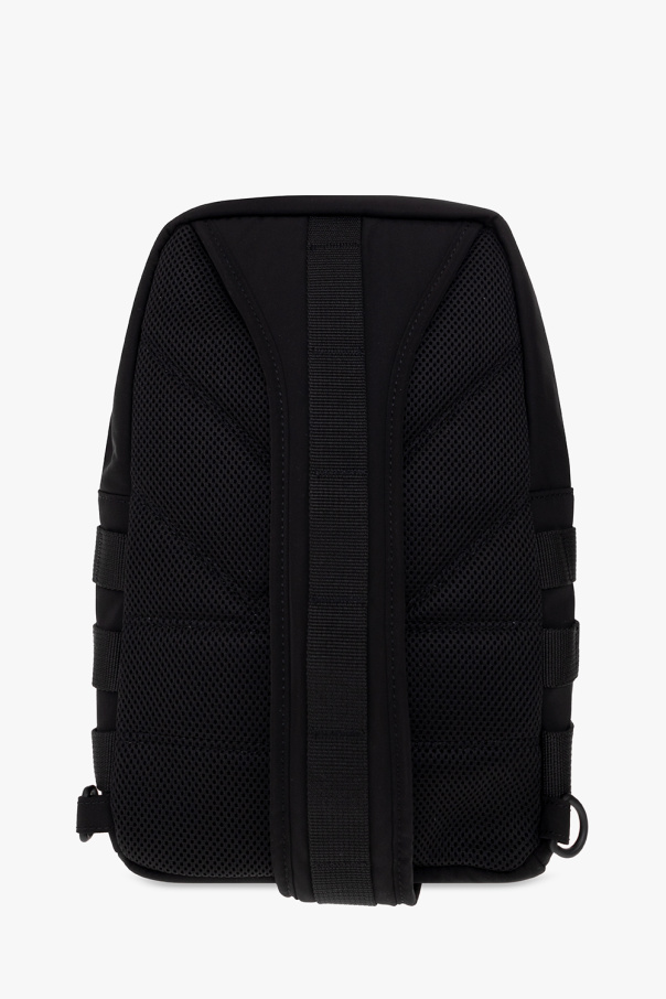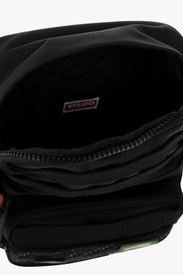 Black one-shoulder backpack from Kenzo. Fastened with a zip, this model features a front zip pocket with velcro and detachable logo patches, adjustable shoulder strap, black metal hardware and one internal compartment with one card slot.