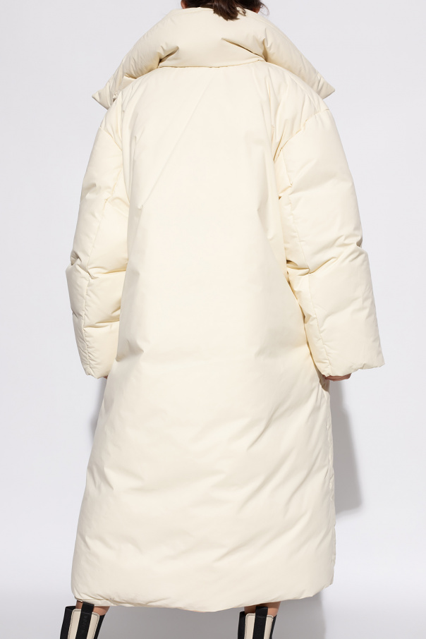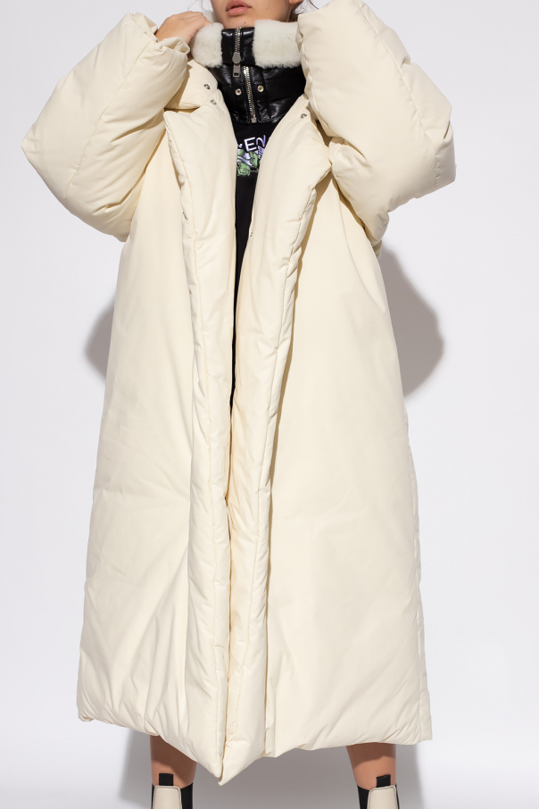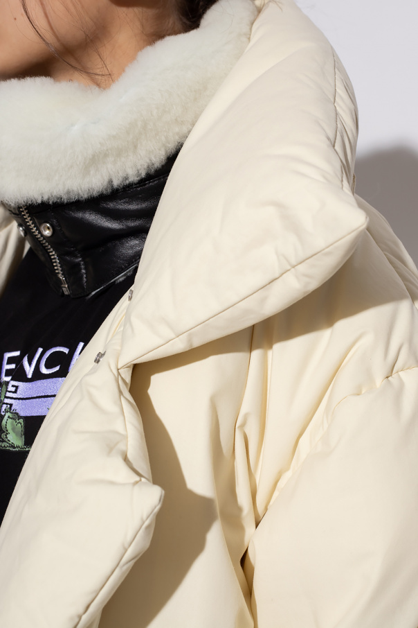 Cream down coat from Givenchy. Fastened with snaps, this long sleeve design features two front pockets and a detachable black collar made of lamb leather and fur.