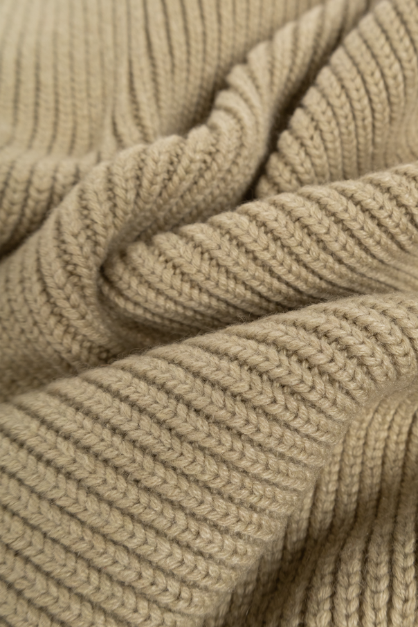Greyish green ribbed scarf from Burberry. Made from cashmere, this design features a dark blue logo embroidery.