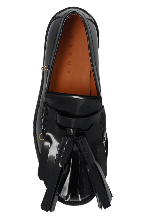 Introducing the 'Bambi' Loafers by Marni, a testament to impeccable craftsmanship and understated luxury. These loafers, beautifully crafted in a lustrous black leather, are the epitome of elegance, seamlessly blending traditional design with contemporary accents. The flat sole with a subtle heel and rounded toe silhouette maintain the classic loafer style, while the polished finish elevates its sophistication. Adorned with a large, decorative tassel and metallic details including buckles and chains, these shoes exude a refined character. The contrast of the light brown leather lining inside offers a discreet pop of color and added comfort. Notably devoid of visible branding, the 'Bambi' loafers speak volumes about the wearer's discerning taste and appreciation for minimalist design. Crafted with a leather outer, inner, and sole, these shoes promise durability alongside their stylish appearance. Why Purchase This Product? Elegance in simplicity with a high-gloss black leather construction. Unique blend of classic and modern elements for a versatile look. Exquisite detailing with tassels and metallic accents for an elevated style. Commitment to quality and comfort with an all-leather construction. Subtle luxury with minimalist branding, focusing on the design and material.