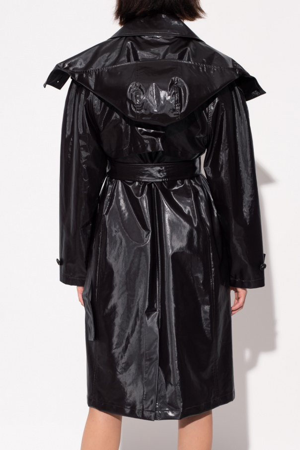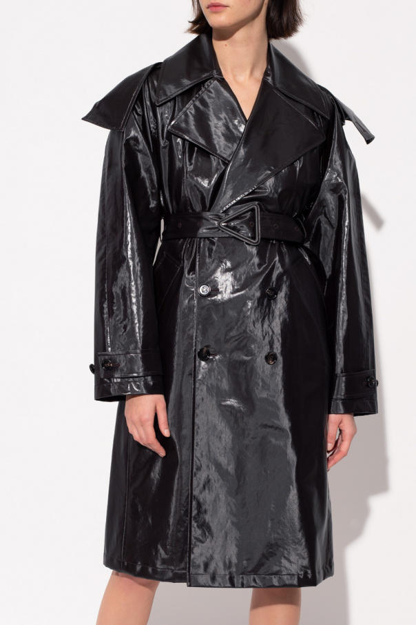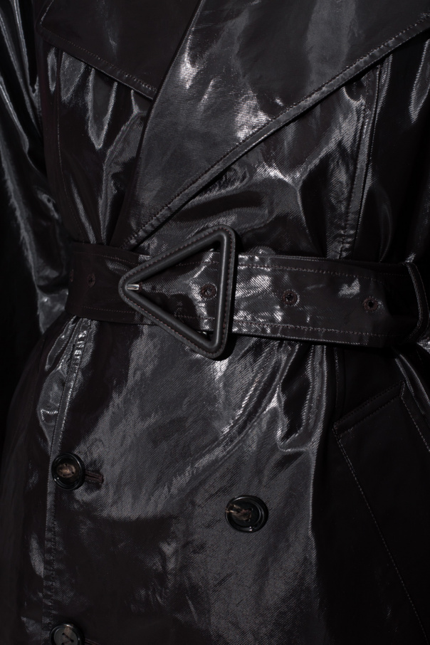 Dark brown trench coat from Bottega Veneta. Made of cotton twill with a double-breasted silhouette, this style features button fastenings, notch lapels, a waist-cinching belt with a leather buckle, epaulettes on the shoulders, four frontal pockets, long sleeves, a single back vent and a detachable blue liner in terry cotton with the iconic ‘Intrecciato’ weave.