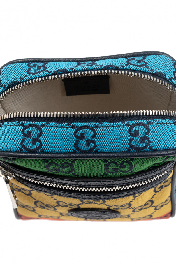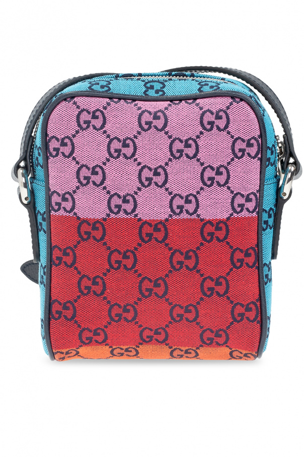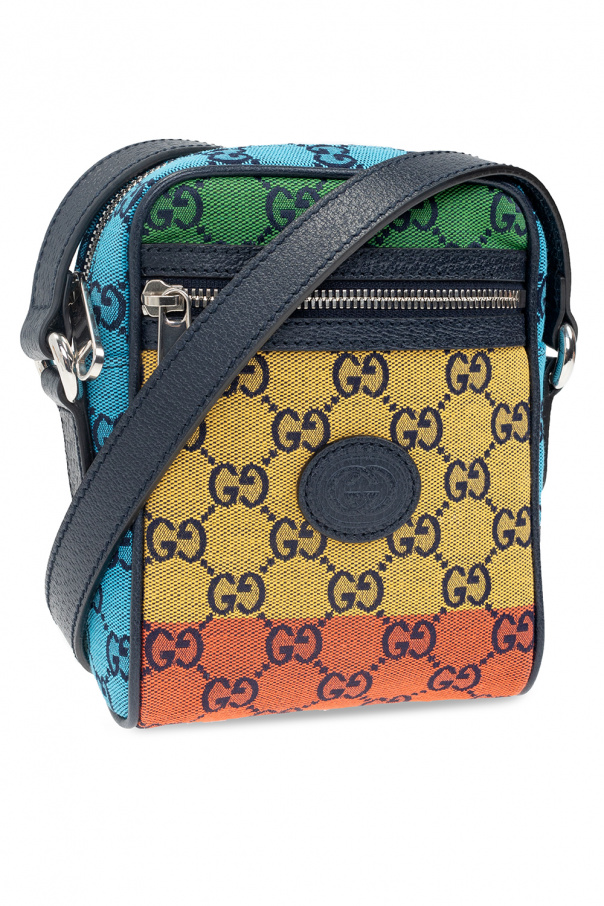 Multicolored shoulder bag from Gucci, the ‘GG Multicolour’ collection. Made of canvas with leather trims, this design fastens with a zip and is decorated with an embroidered logo pattern and leather logo appliqué in black. It is complete with an adjustable strap, silver-tone metal hardware and one internal compartment with cream lining.