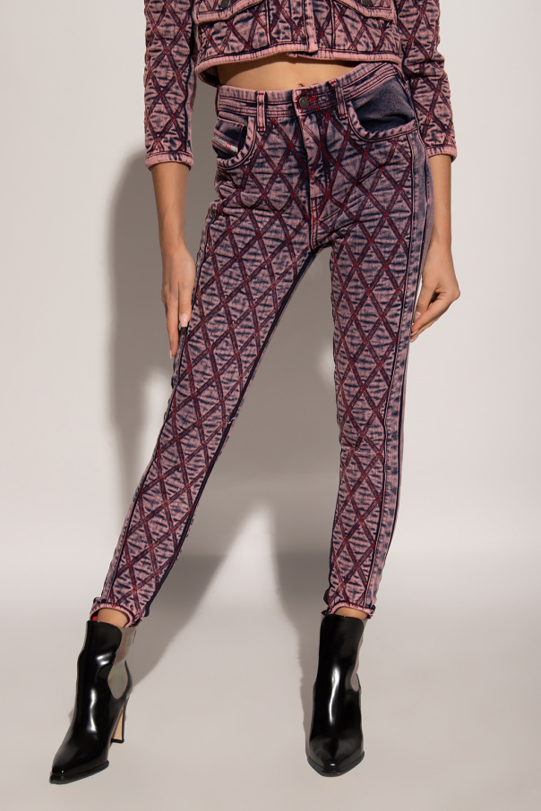 Pink, navy blue and red quilted jeans from Diesel. Crafted from cotton with a super skinny fit, this pair features a zip fly with a button, red stitching details and cut-out hems with elastic trims.