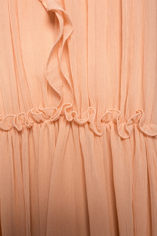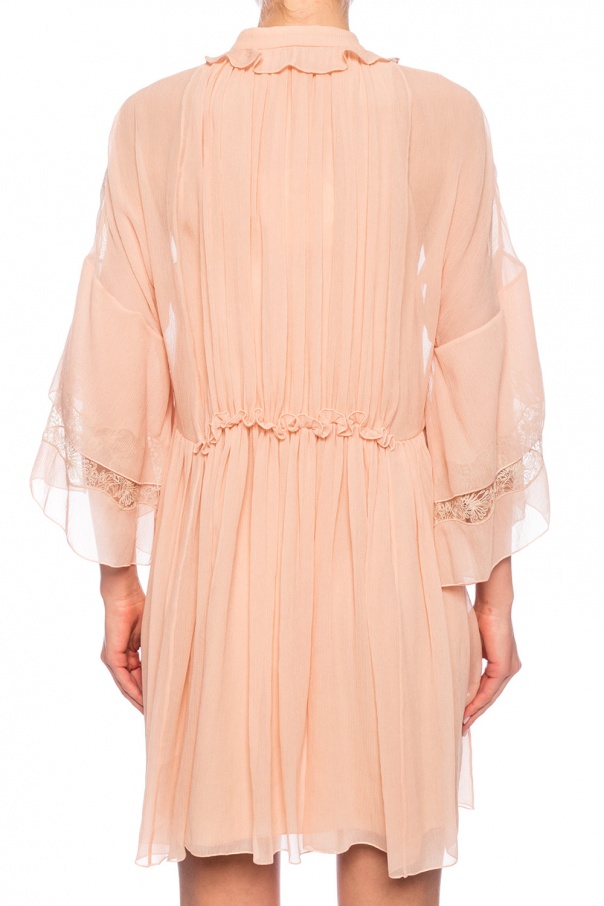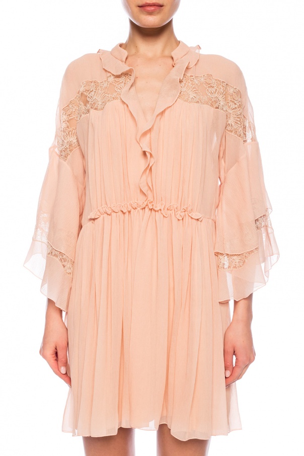 Light pink dress with a lace trim from Chloé. Made of silk. V-neck. Decorated with ruffles. Flared sleeves.