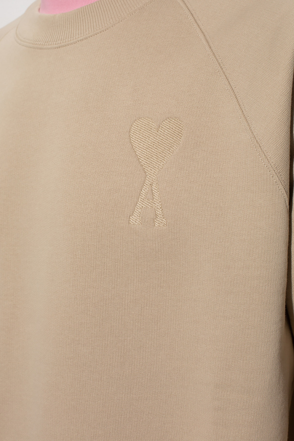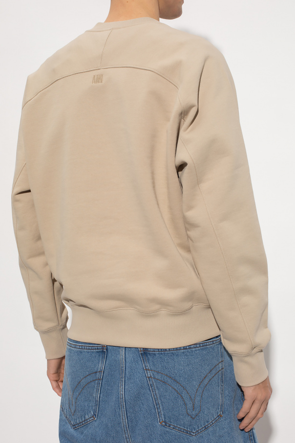 Beige crewneck sweatshirt from Ami Alexandre Mattiussi. Crafted from GOTS-certified organic cotton, this style showcases the brand's signature ‘ami de cur’ embroidery on the front, logo embroidery at the back and ribbed trims on the collar, bottom hem and cuffs.