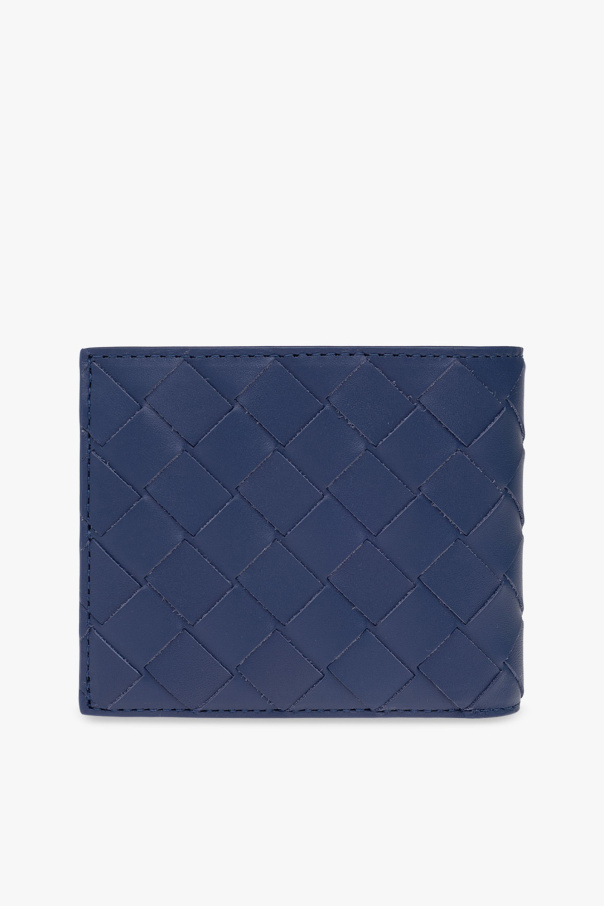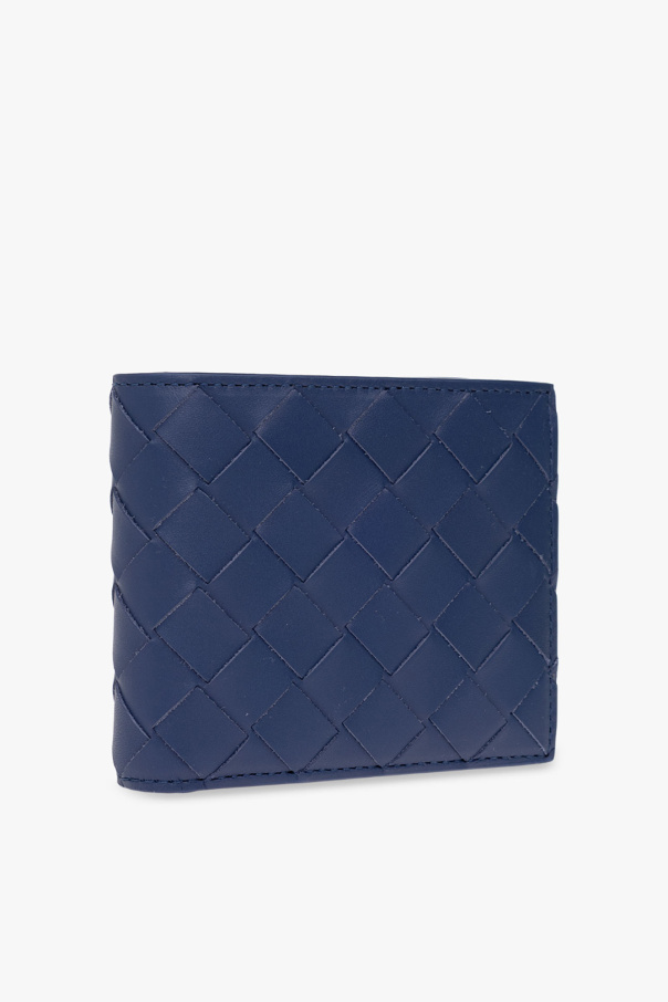 Navy bifold wallet from Bottega Veneta. Made of calf leather with the iconic Intrecciato weave, this item features one snap-fastened coin pocket, two bill compartments, two slip pockets and four card slots inside.