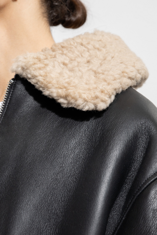 Black ‘Hamel’ shearling jacket from AllSaints. Crafted from sheep leather and light beige shearling, this style features a two-way zipper, two frontal pockets, long sleeves and a buckle belt at the waist.