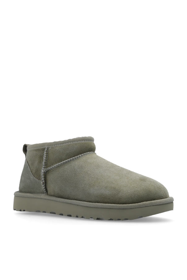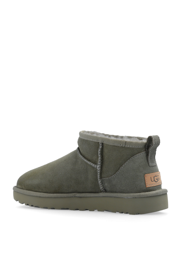 Greyish green ‘Classic Ultra Mini’ snow boots from UGG. Made from soft sheep leather, this model sits on a grey Treadlite by UGG™ rubber outsole and features a back logo patch and the UGGpure™ wool insole.