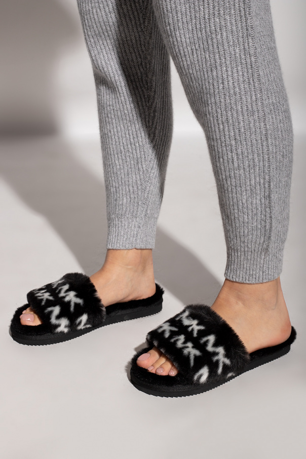 Black and white ‘Janis’ slides from Michael Michael Kors. Trimmed with faux fur, this pair features a white logo print, open toe and black rubber sole.