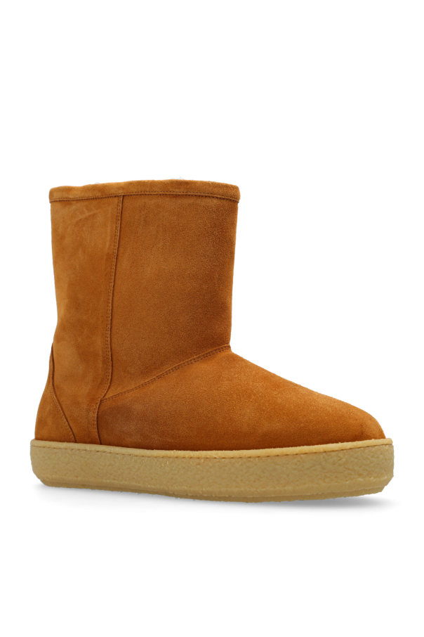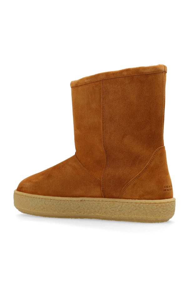 Brown ‘Frieze’ snow boots from Isabel Marant. Made from calf suede and lined with cream lamb fur, this model sits on a beige rubber sole and features an embossed logo at the back.