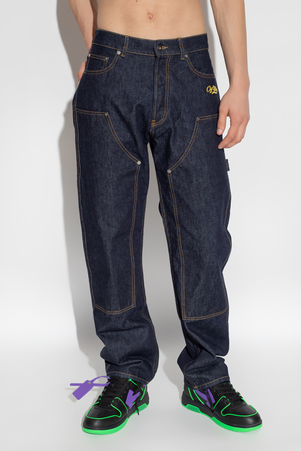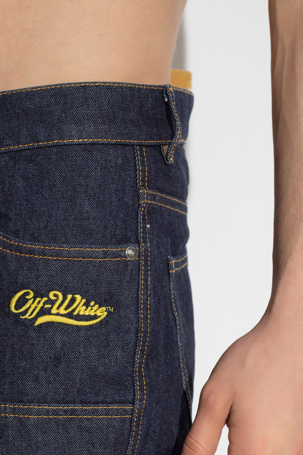 Navy straight leg jeans from Off-White. Fastened with buttons, this pair features a yellow logo embroidery on the front, patch at the back, three front pockets, two back pockets and patches.