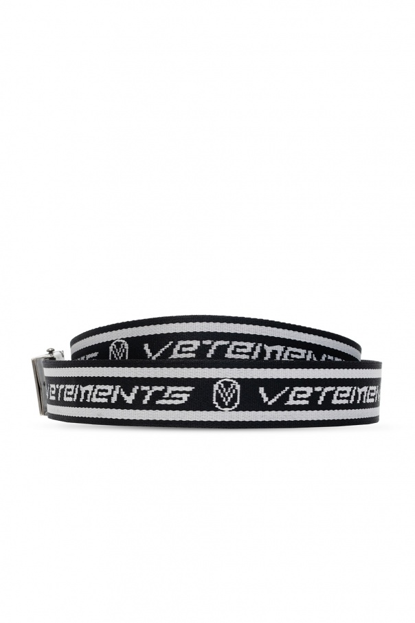 Black and white belt from VETEMENTS. Crafted from cotton jacquard knit with the brand's logo, this item is complete with an antiqued silver-tone logo-embossed buckle.