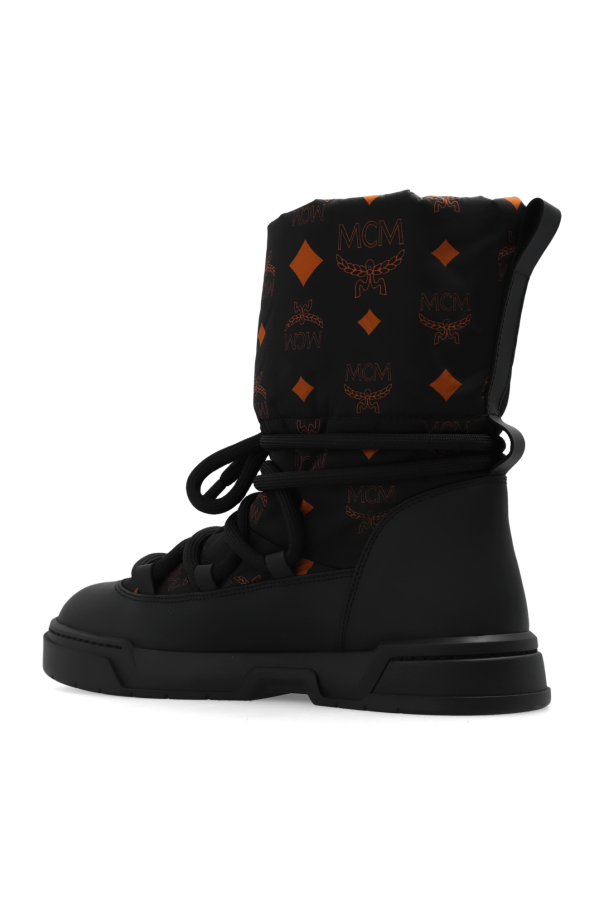 Black ‘Skyward Hi’ snow boots from MCM. Made of fabric trimmed with leather, this pair features decorative lacing, a brown monogram pattern and a black rubber sole.