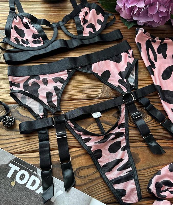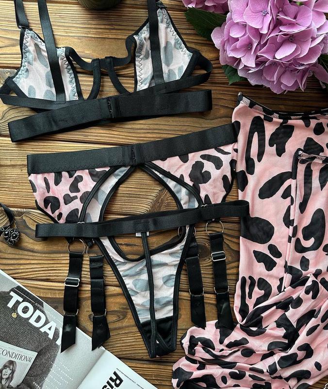 Тип:Бюстгальтер , Комплект , Трусики ,Модель:С открытым доступом , С пажами для чулок ,Принт:Животный , Леопардовый ,Описание