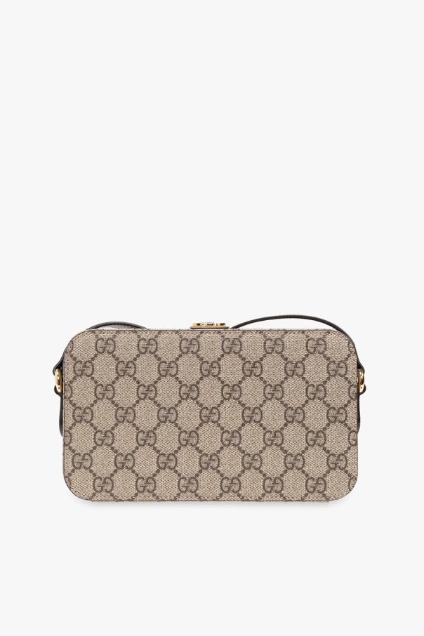 Brown and cream shoulder bag from Gucci. Made of GG Supreme canvas, this design fastens with a snap button and is decorated with a monogram pattern and logo patch. It has a shoulder strap, gold-tone metal hardware and one internal compartment with one slip pocket.