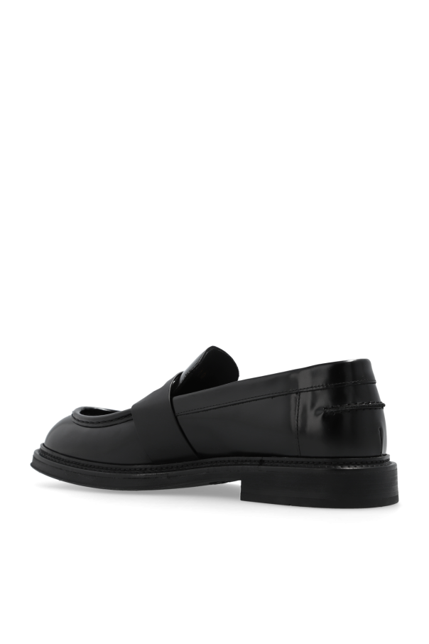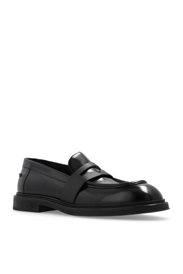 Black loafers from Emporio Armani. Made of leather, this pair features a tactile logo and a black rubber sole.