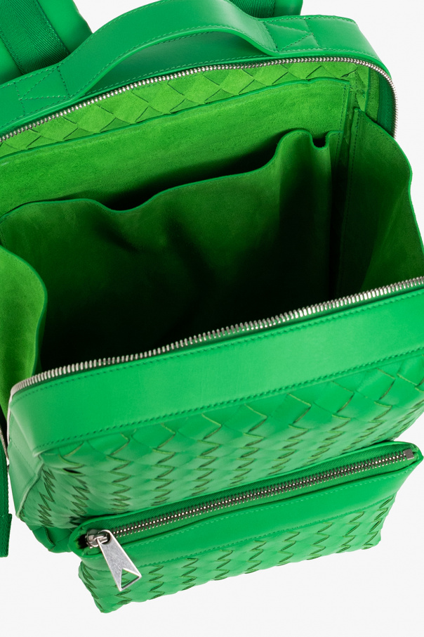 Green ‘Classic Hidrology Small’ backpack from Bottega Veneta. Made of leather with fabric trims, this model features a two-way zip, the brand’s signature Intrecciato weave, front zip pocket, half-round handle, adjustable shoulder straps, silver-tone metal hardware and one internal compartment with one slip pocket.