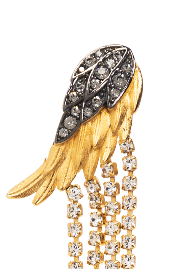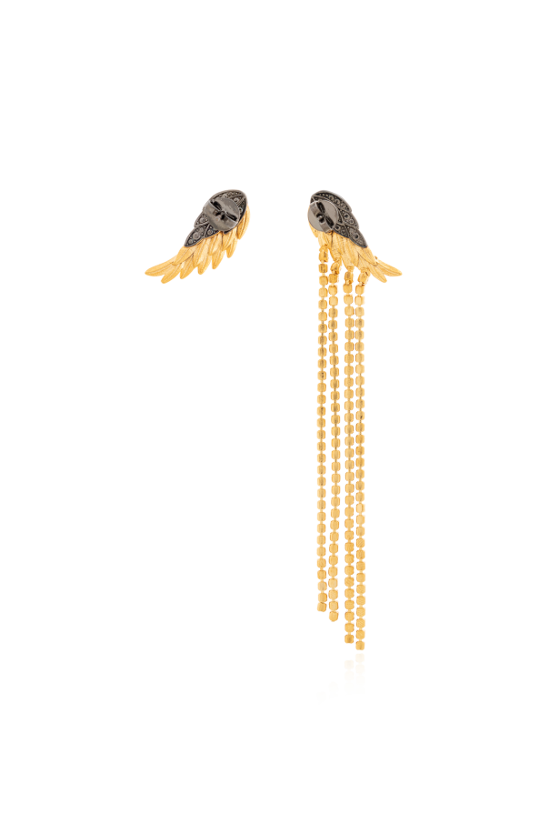 Gold and silver-tone ‘Rock’ asymmetrical earrings from Zadig & Voltaire. Made of brass, they secure with push back closures and showcase wings applications and crystals. One earring has glossy fringes.