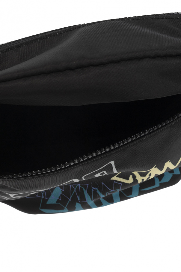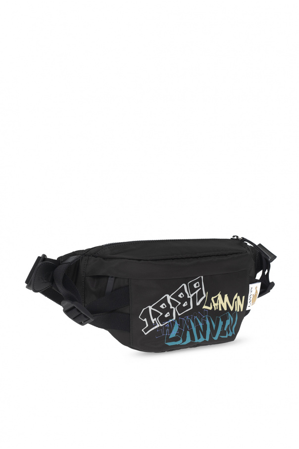 Black belt bag from Lanvin. Embellished with a logo patch and a colourful graphic pattern, this design features a zip fastening, a back zip pocket, an adjustable strap, raw hems and one internal compartment with a slip pocket.