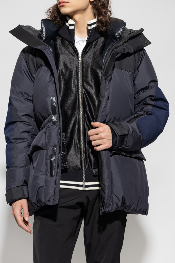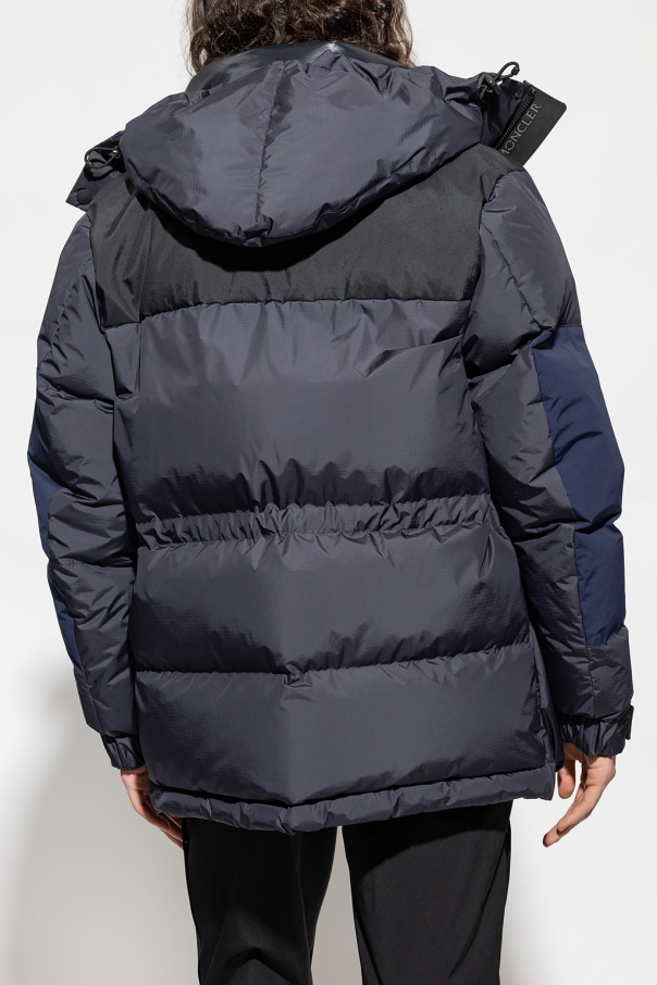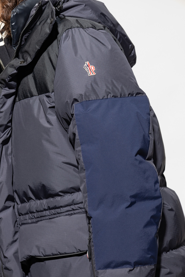 Navy blue ‘Roybon’ down jacket from Moncler Grenoble, the ‘Moncler Grenoble Performance & Style’ collection. Emblazoned with a logo patch, this style secures with a velcro closure and a two-way zipper and features a drawcord-adjustable hood and hem, two zip pockets, two flapped pockets and long sleeves with elasticated cuffs and thumbholes.