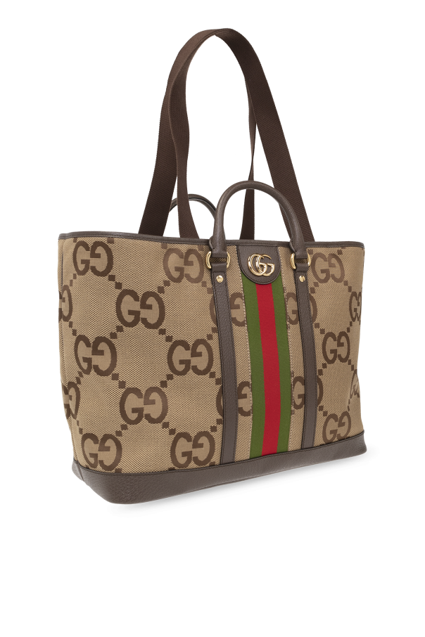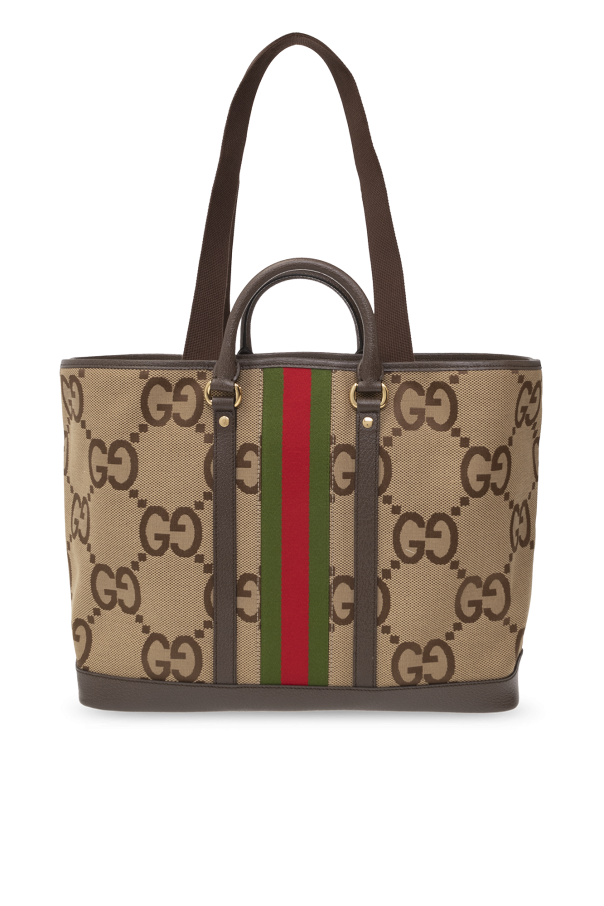 Beige and brown shopper bag from Gucci. Crafted from ‘GG Supreme’ canvas and trimmed with leather, this design showcases green and red ‘Web’ stripe detailing, ‘Double G’ hardware, antiqued gold-tone metal elements, two short leather handles, two long fabric handles and one internal compartment with a zip pocket.
