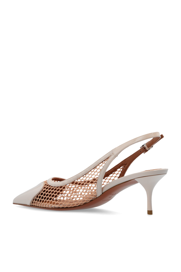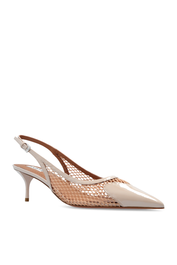 Beige pumps from Alaia. Made from mesh and patent leather, this model sits on a brown sole in leather and rubber and showcases an adjustable strap with a buckle, an open heel and a pointed toe embellished with a signature heart motif.
