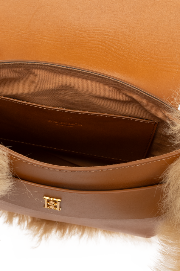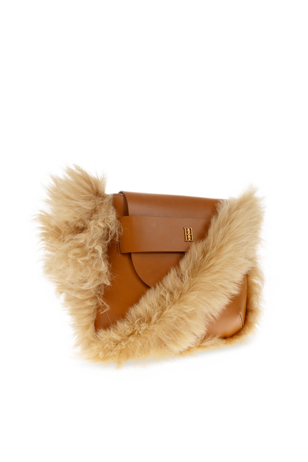 Brown ‘Etlon’ shoulder bag from By Malene Birger. Made of leather and trimmed with beige sheep fur, this design secures via a sliding closure with a metal logo plaque and features a shearling shoulder strap, gold-tone metal hardware and one internal compartment with a slip pocket.