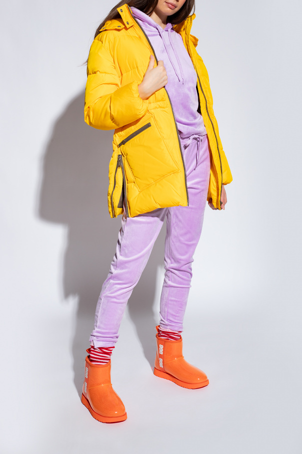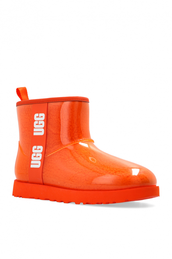 Orange ‘Classic Clear Mini’ snow boots from UGG. Resting on an orange rubber sole, this pair features a white logo. Lightweight and weather-rated to temperatures as low as -20°C.