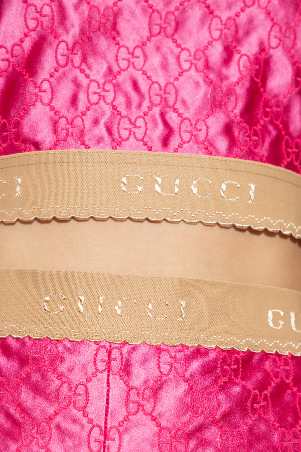 Pink shorts from Gucci. Crafted from monogrammed silk, this pair features a high-rise waist, a hidden zipped on the side, a beige elasticated waistband with a logo and a two frontal pockets.