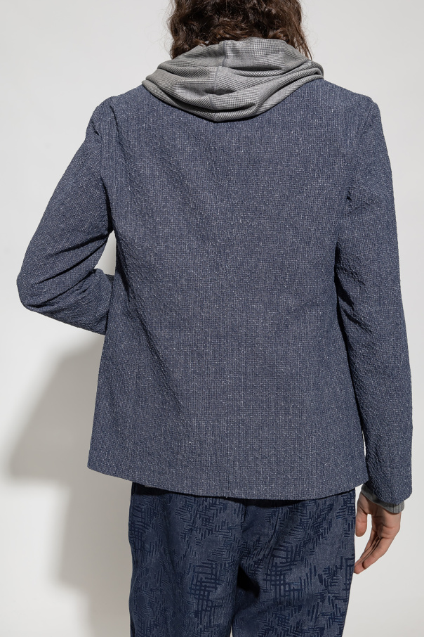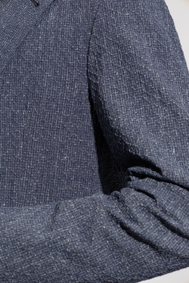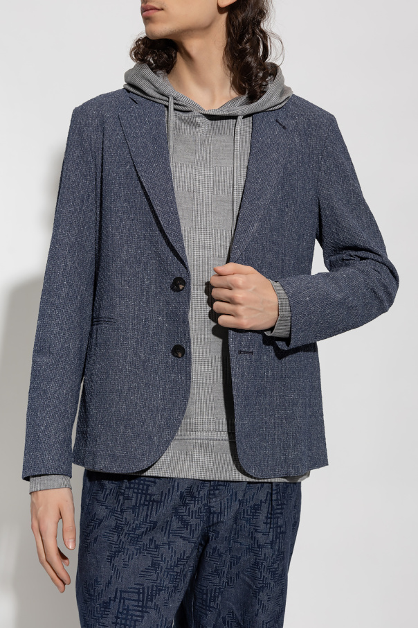 Greyish navy single-breasted blazer from Emporio Armani. Made of a textured linen blend, this garment features button fastenings, notch lapels and fitted long sleeves.